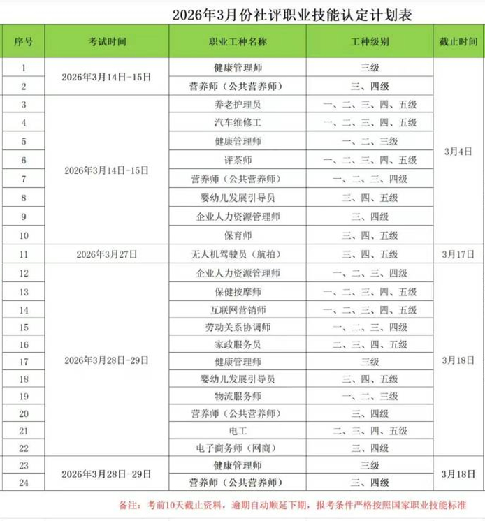根据职业技能等级认定有关要求和相关社会培训评价组织职业技能等级认定公告,现将2026年3月28、29日企业人力资源管理师、保健按摩师、互联网营销师、劳动关系协调师、家政服务员、健康管理师、婴幼儿发展引导员(育婴员)、物流服务师、营养师(公共营养师)、电工、电子商务师职业技能等级认定考核安排通知如下: