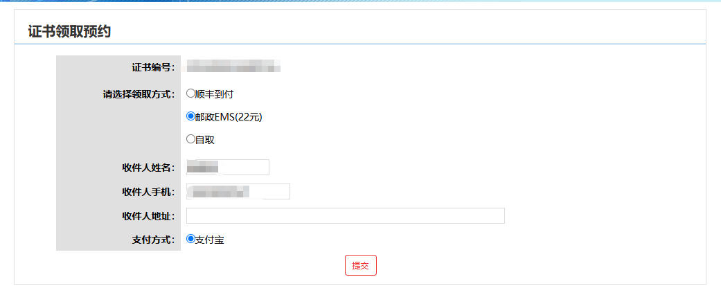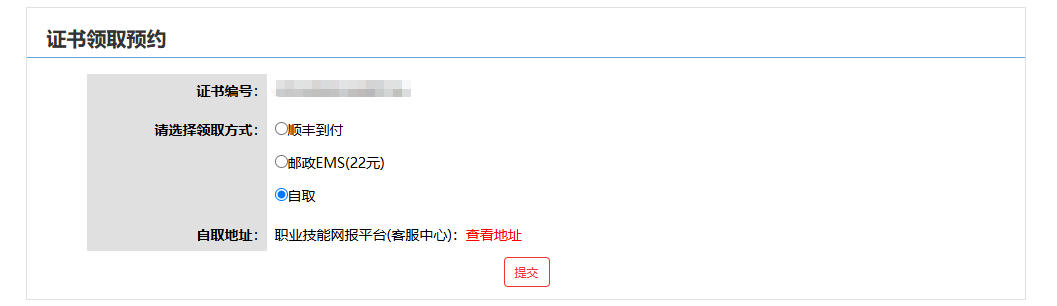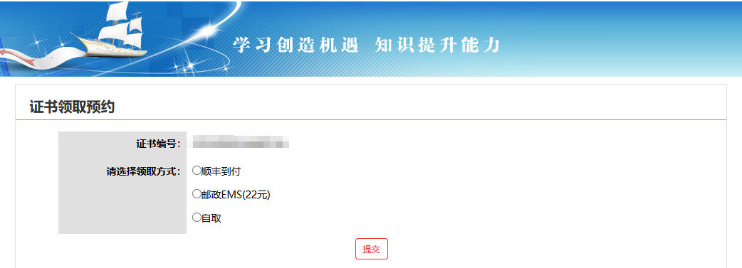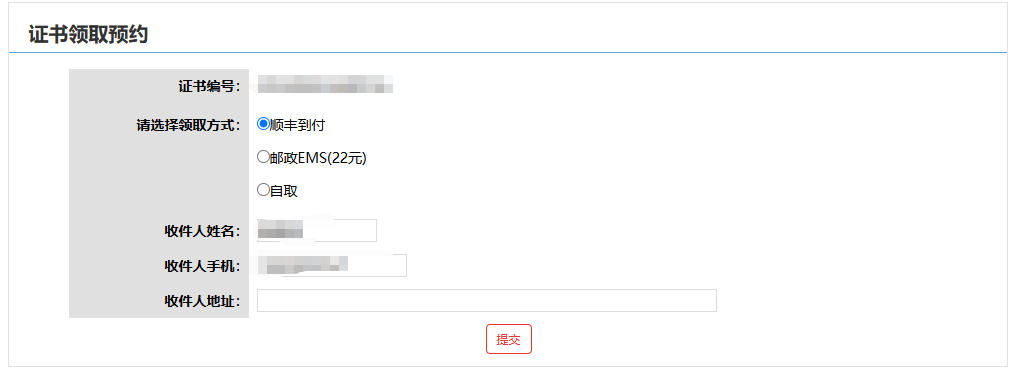 四、选择领取方式:(1)自取:携带本人身份证原件;(2)代领:考生本人身份证复印件,代领人身份证原件。(3)邮政EMS快递(邮寄需填写详细收件人信息并支付邮寄费用)或者顺丰到付,证书统一邮寄后,会统一发送短信通知。