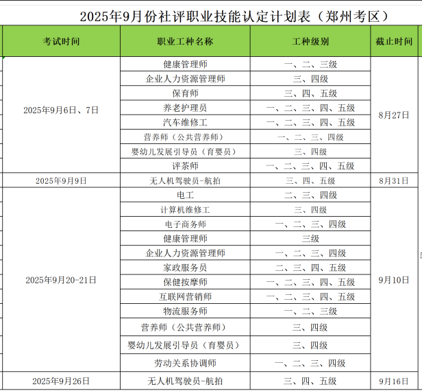 【考试安排】2025年9月企业人力资源管理师、健康管理师、保育师、养老护理员、汽车维修工、无人机驾驶员(航拍、植保)、无人机装调检修工、家政服务员、保健按摩师、互联网营销师、物流服务师、电子商务师、电工、计算机维修工职业技能等级认定考试工作安排的通知