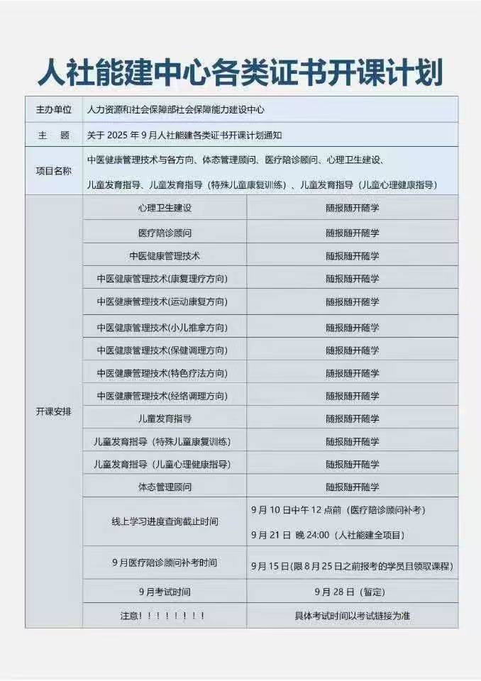 人力资源和社会保障部教育培训网(人社部能力建设中心):2025年9月28日批次国防教育辅导、医疗陪诊顾问、体重管理技术、中医健康管理技术(保健调理方向、经络调理方向、康复理疗方向、特色疗法方向、小儿推拿方向)、心理卫生建设、心理健康咨询、保健调理技术(高级)、皮肤管理技术、生殖健康咨询技术、家政护理(母婴护理方向、老年护理方向、病患护理方向)等职业技能培训证书考试安排通知