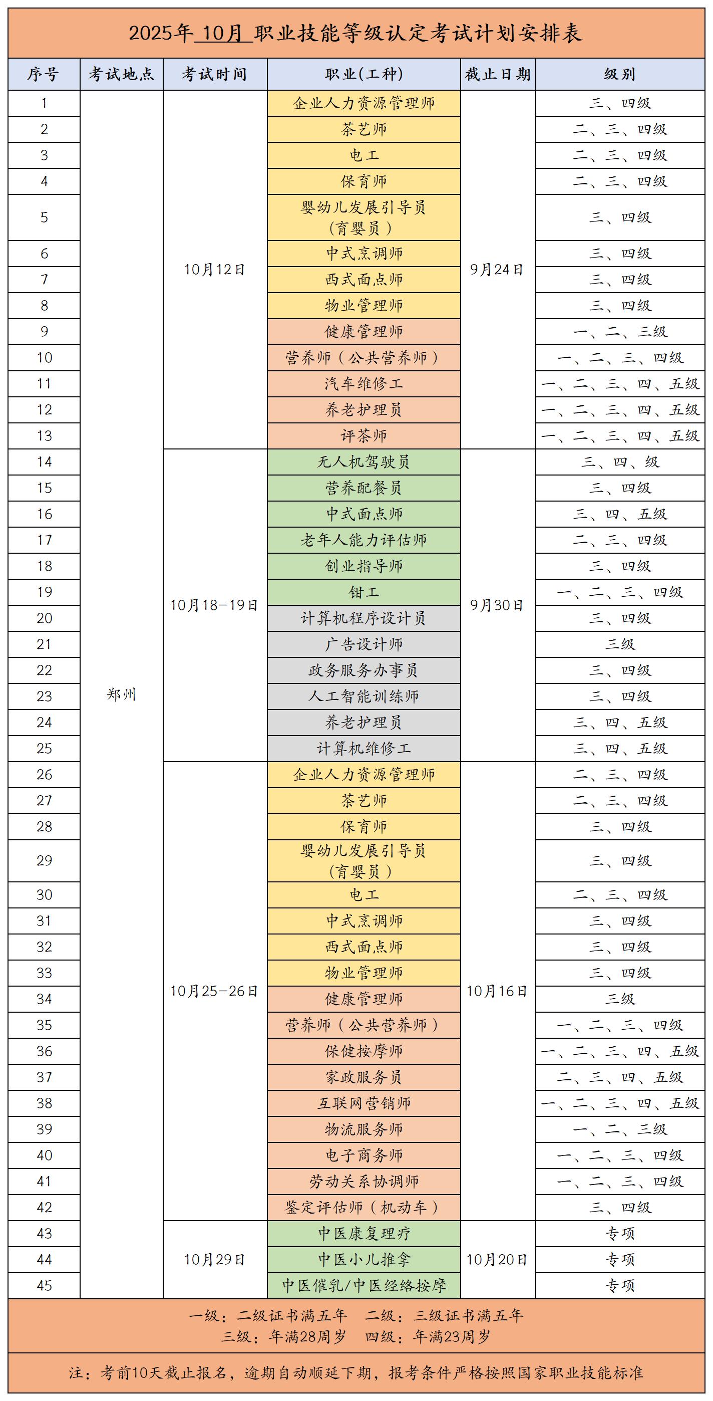 【考试安排】2025年10月18、19日无人机驾驶员、营养配餐员、中式面点师、老年人能力评估师、创业指导师、钳工、计算机程序设计员、广告设计师、政务服务办事员、人工智能训练师、养老护理员、计算机维修工职业技能等级认定考试工作安排的通知等职业技能等级认定考试工作安排的通知