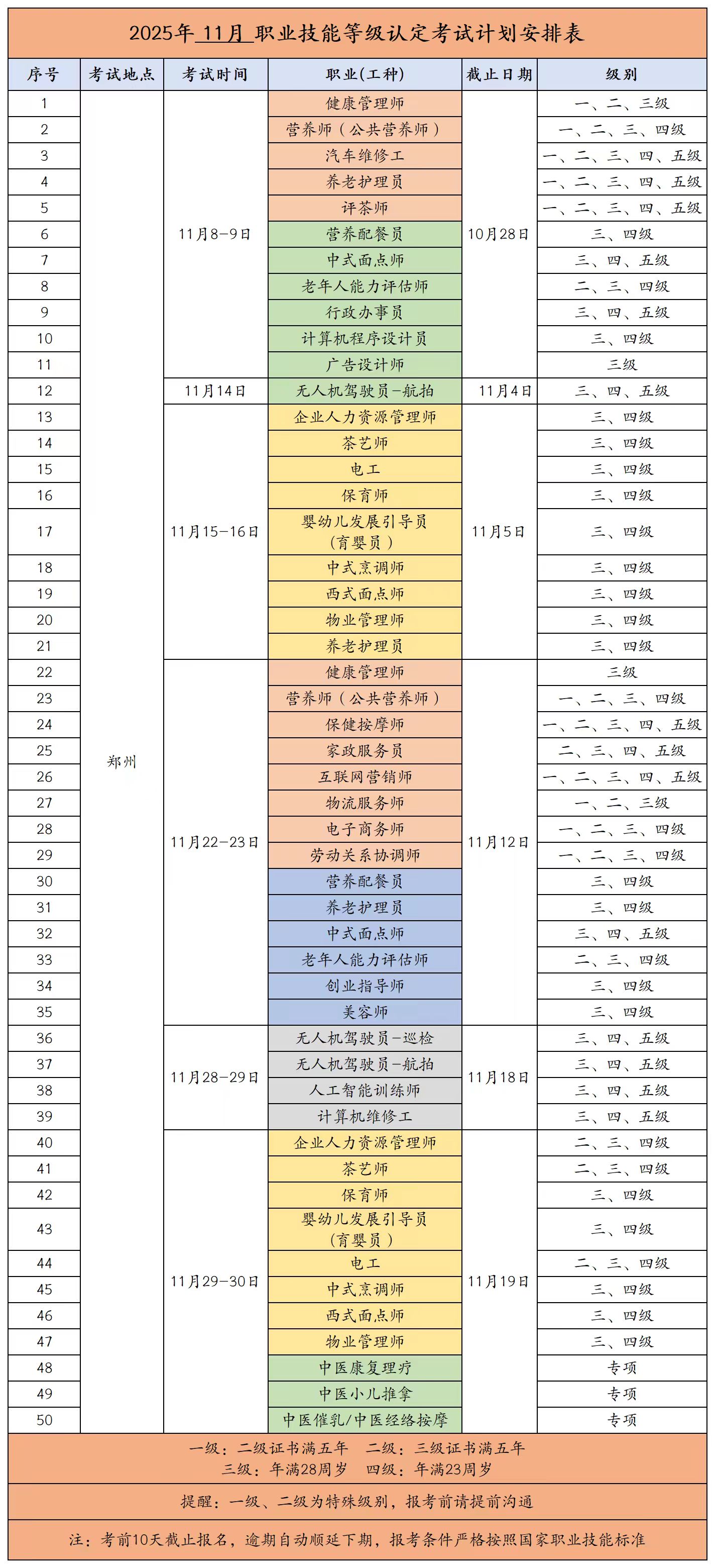 【考试安排】2025年11月22、23日企业人力资源管理师、人工智能训练师、老年人能力评估师、计算机维修工、健康管理师、保育师、养老护理员、汽车维修工、营养师(公共营养师)、婴幼儿发展引导员(育婴员)、评茶员、无人机驾驶员、创业指导师、钳工、电工、电子商务师、家政服务员、保健按摩师、互联网营销师、物流服务师、劳动关系协调员等职业技能等级认定考试工作安排的通知等职业技能等级认定考试工作安排的通知