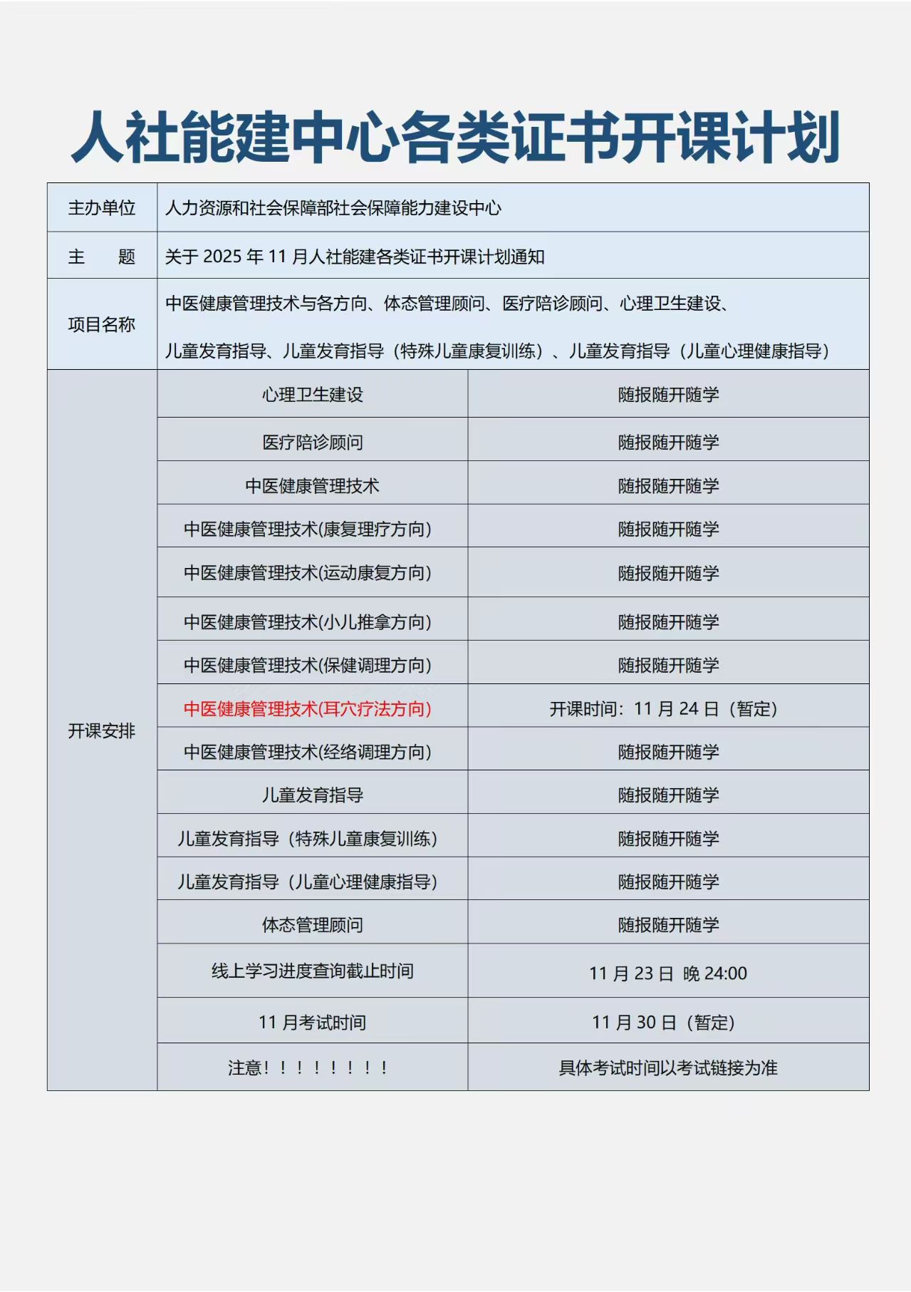人力资源和社会保障部教育培训网(人社部能力建设中心):2025年11月30日批次国防教育辅导、医疗陪诊顾问(陪诊师)、体态管理顾问、儿童发育指导、中医健康管理技术(保健调理方向、经络调理方向、康复理疗方向、特色疗法方向、小儿推拿方向)、心理卫生建设、心理健康咨询、保健调理技术(高级)、皮肤管理技术、生殖健康咨询技术、家政护理(母婴护理方向、老年护理方向、病患护理方向)等职业技能培训证书考试安排通知