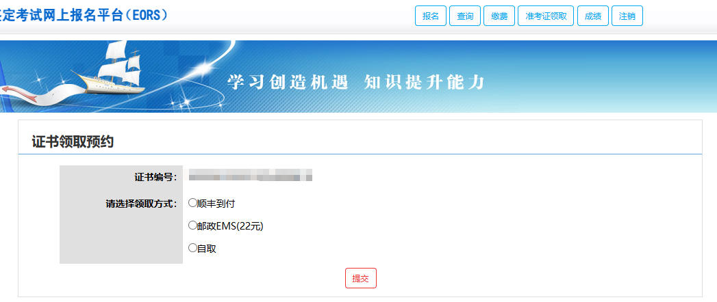 四、选择领取方式:(1)自取:携带本人身份证原件;(2)代领:考生本人身份证复印件,代领人身份证原件。(3)邮政EMS快递(邮寄需填写详细收件人信息并支付邮寄费用)或顺丰到付,证书统一邮寄后,会统一发送短信通知。