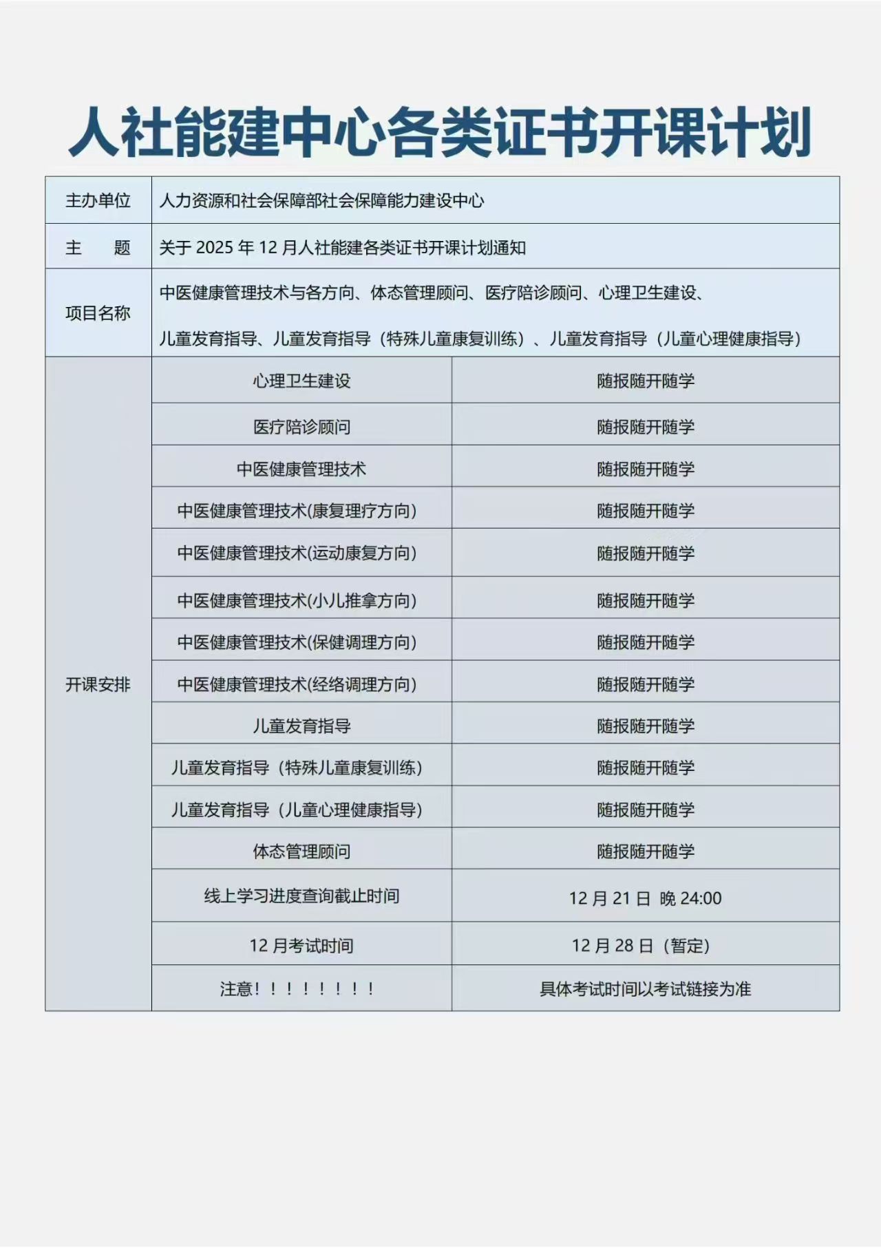 人力资源和社会保障部教育培训网(人社部能力建设中心):2025年12月28日批次国防教育辅导、医疗陪诊顾问(陪诊师)、体态管理顾问、儿童发育指导、中医健康管理技术(保健调理方向、经络调理方向、康复理疗方向、特色疗法方向、小儿推拿方向)、心理卫生建设、心理健康咨询、保健调理技术(高级)、皮肤管理技术、生殖健康咨询技术、家政护理(母婴护理方向、老年护理方向、病患护理方向)等职业技能培训证书考试安排通知
