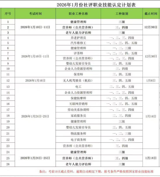 根据职业技能等级认定有关要求和相关社会培训评价组织职业技能等级认定公告,现将2026年1月10、11日企业人力资源管理师、健康管理师、保育师、养老护理员、汽车维修工、营养师(公共营养师)、婴幼儿发展引导员(育婴员)、评茶员职业技能等级认定考核安排通知如下: