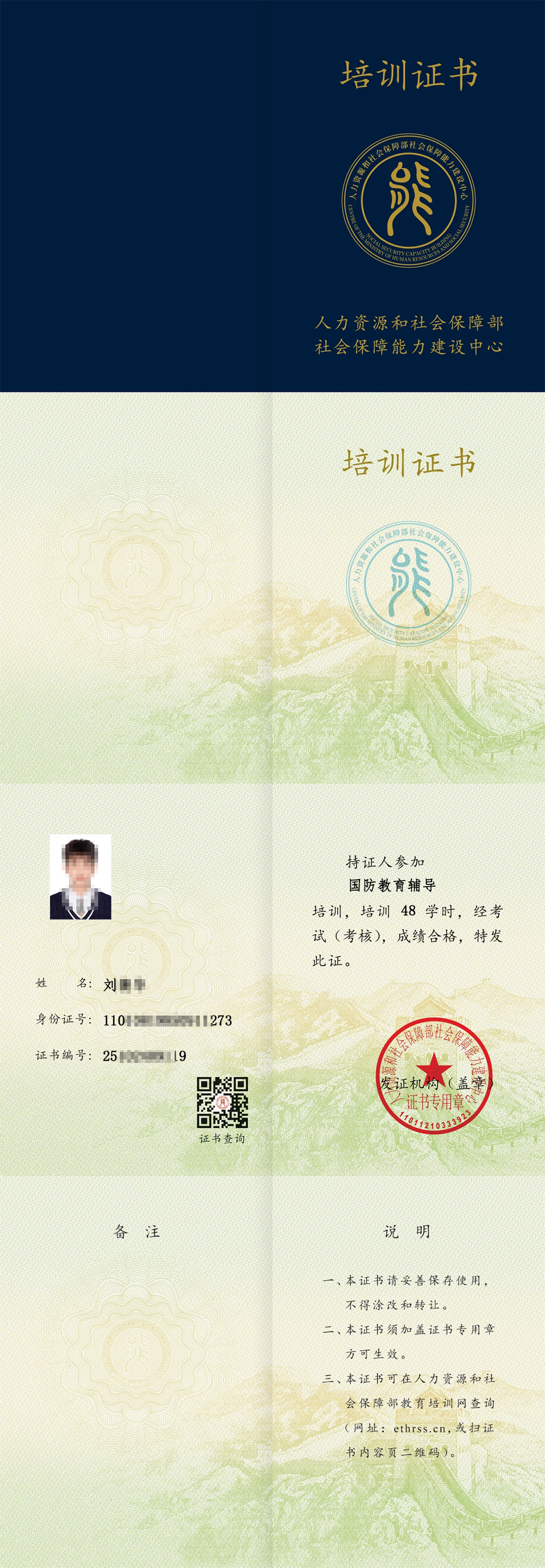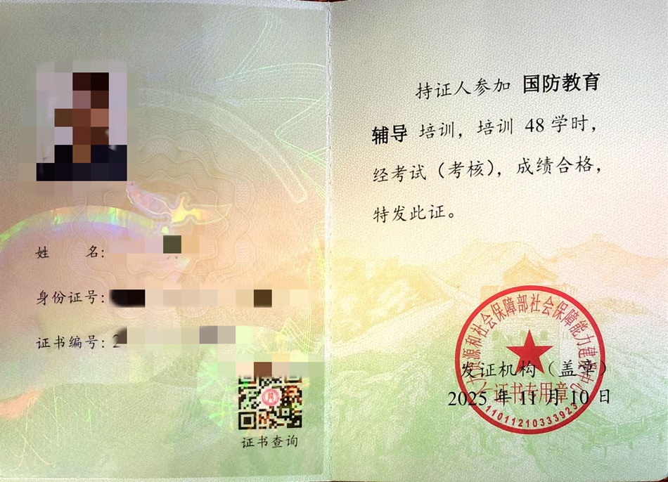 【证书领取】人社部能力建设中心:2025年10月30日国防教育辅导职业技能培训证书领取通知